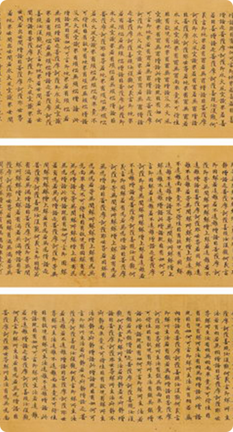 此卷用纸为经黄打纸在唐代属上品,所用之处多代表高等级的身份与地位。砑光上蜡,帘纹细腻,薄且密度大。全经书写一气呵成,用笔恭敬,字体风格古朴大气,既有此经生独有的风格,亦展现了南北朝时期至唐初期书法演变的痕迹,区别于唐中期的成熟楷体。此卷末可见为装轴所留燕尾,全长近十米,未经托裱,表现了敦煌遗书最原始的风貌,当为藏家可宝。